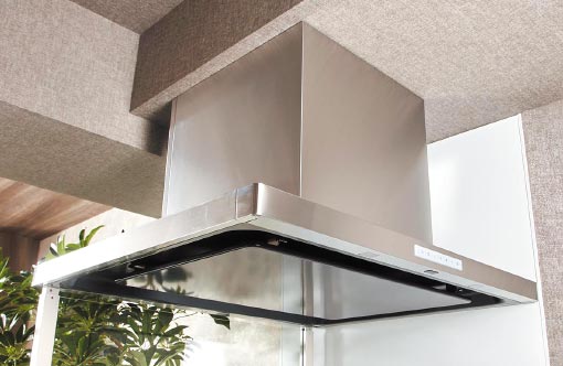 見た目も美しいマントル型レンジフード。取り外しも簡単で、油汚れもサッと拭き取れるホーロー整流板付。