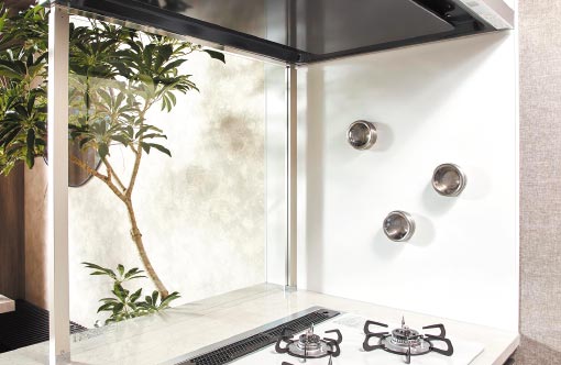 ガラスの美しさと鉄の強さを併せ持つ、高品位ホーローキッチンパネルを採用。サッと拭くだけで簡単にお手入れができます。また、スタイリッシュなガラスのオイルガードも採用。