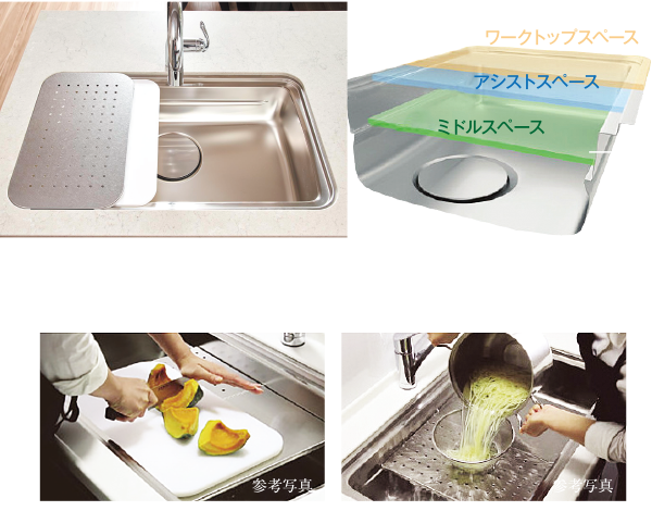 上面とミドルスペースが使い分け出来るユーティリティーシンクE。シンクの上面には、まな板・水切りなどのプレートが置け、多目的にご使用いただけます。またミドルスペースには専用の調理プレートを設置でき、魚を洗いながらの調理も可能です。専用の水切りプレートを置けば、シンクの汚れを気にせずゆでこぼしもできます。