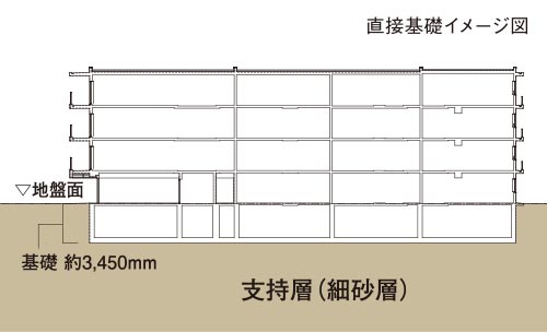 地盤調査により地盤の許容支持力を正確に割り出し、地下の強固な地質に支持する「直接基礎」を採用。確かな強さを備えた地盤の上で、大きな面により地盤と建物をしっかりと一体化させています。