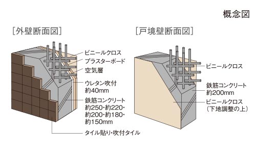 建物の遮音性を高め快適な室内環境を実現するため、外壁は約250・約220・約200・約180・約150mm戸境壁は約200mmのコンクリート厚を確保。主要構造部にあたる壁は、鉄筋を二重に組むダブル配筋(一部千鳥配筋)を標準として施工。ダブル配筋は、シングル配筋よりも高い強度と耐久性を実現しています。※一部壁を除く