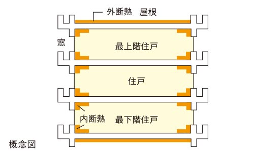 外壁に面する壁、最下階住戸の床スラブ下、最上階住戸の天井スラブなど、建物全体に断熱対策をしています。屋根スラブ部分の外や、最下階の床スラブ裏にはポリスチレンフォーム等の保温板、外壁部分の内断熱には、現場発泡硬質ウレタンフォーム等を採用しています。
