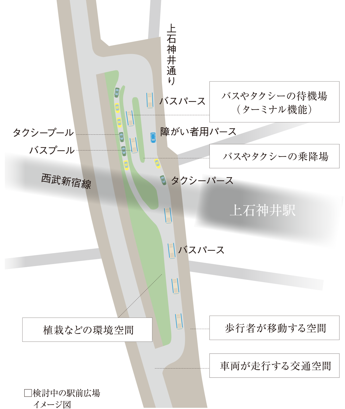 鉄道施設とともに、上石神井駅の拠点性・魅力の向上に寄与する新たな土地利用の誘導を促進する。