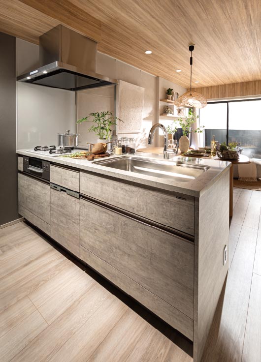 ガラスの美しさと鉄の強さを併せ持つ、高品位ホーローキッチンパネルを採用。サッと拭くだけで簡単にお手入れができます。また、スタイリッシュなガラスのオイルガードも採用。