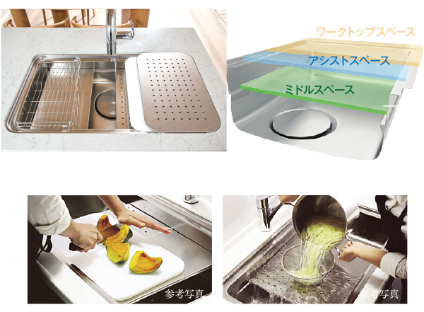 上面とミドルスペースが使い分け出来るユーティリティーシンクE。シンクの上面には、まな板・水切りなどのプレートが置け、多目的にご使用いただけます。またミドルスペースには専用の調理プレートを設置でき、魚を洗いながらの調理も可能です。専用の水切りプレートを置けば、シンクの汚れを気にせずゆでこぼしもできます。